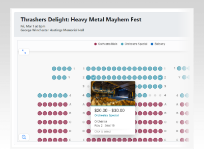 Listing reserved seating events on our platform is simple, and our Support team will custom build your seating chart to your specifications. Customers can easily locate and purchase tickets to your events using the seat map selector.